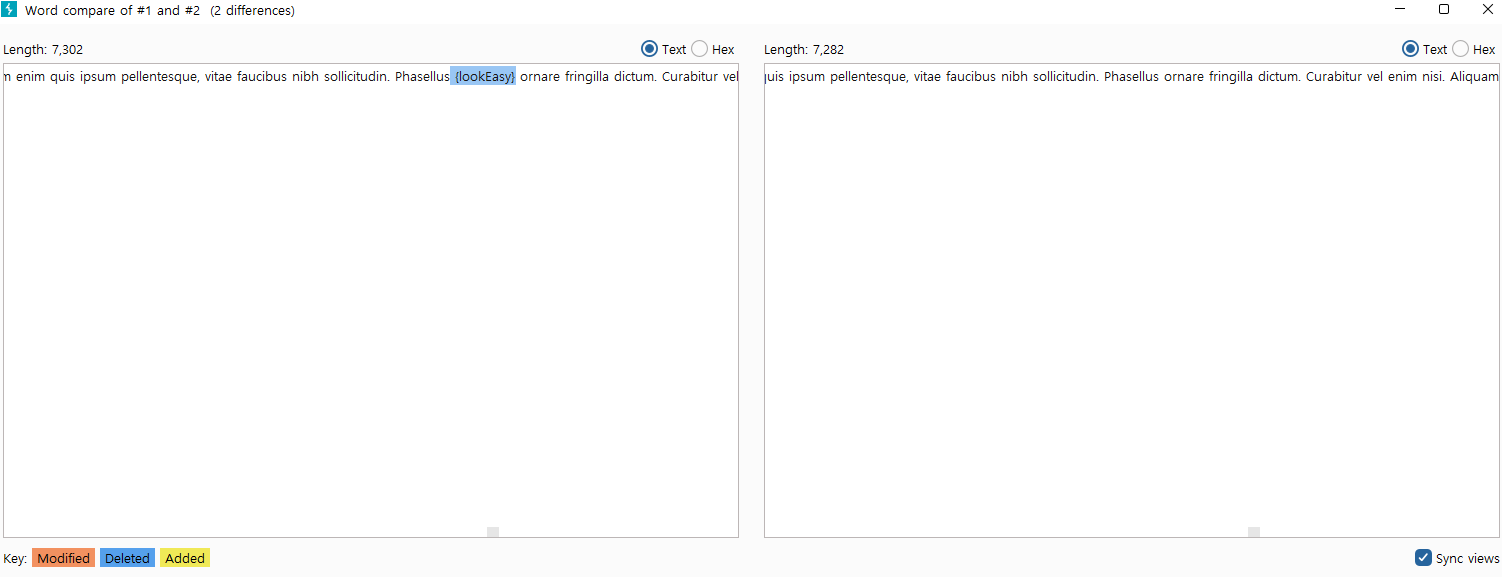 이런식으로 나옵니다 words는 말 그대로 단어 하나하나를 비교해주고 bytes는 말 그대로 byte단위로 비교를 해줍니다.