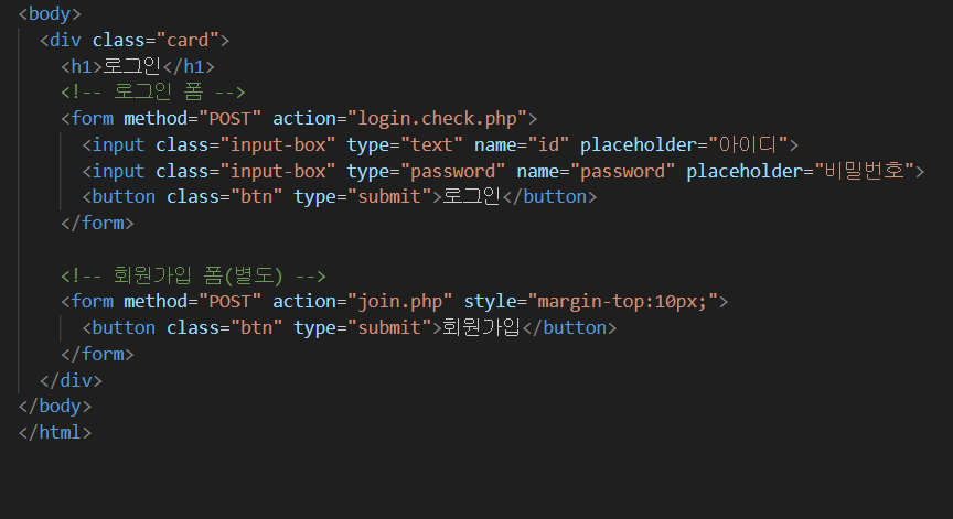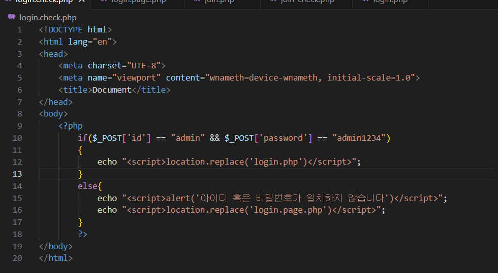 db를 연동하지 않았기때문에 if문을 사용하여 id와 pw를 지정해두고 코드를 짰습니다. id : admin pw : admin1234 일때만 첫줄 echo가 작동하구요 그게 아니면 else 코드가 작동합니다. 이렇게 보면 어려울수 있는데 한줄씩 읽으면 이해가 되긴 합니다. ㅎㅎㅎ 이렇게 해서 1주차 과제가 끝이 났습니다.