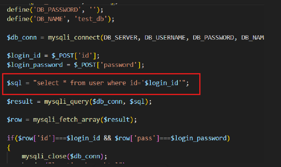 네모칸 안에 있는 sql문을 작성해서 비교를 해줍니다. select * 모든 테이블을 불러옵니다. where are you from 할때 그 from입니다 해석하면 너 어디에서 왔니? 랑 똑같이 어디? user라는 컬럼에서 불러옵니다 where도 똑같이 아까 말했듯 user라는 컬럼 안에 어디? id라는 row = 행 을 찾아서 출력해줍니다. 하지만 지금은 출력하는게 아니라 비교를 해야겠죠 그래서 $login_id 변수를 select문에 집어 넣습니다. 이제 그거를 $result라는 변수안에집어넣고요 $row 라는 변수 안에 넣어주면 실행 완료입니다.