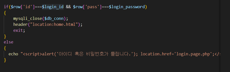 그리고 if문은 이용해서db안에있는 id와 pass를 비교해주면  참일때 homt.html로 이동 거짓이면 로그인 실패문구가뜨게 됩니다.