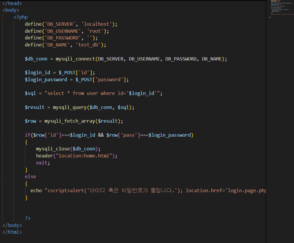 그리고 POST방식에 id 와 password를 각각 id와 password라는 변수 안에 넣어줍니다. 그리고 db 안에있는 아이디와 패스워드를 비교해서 맞으면 로그인 아니면 로그인 실패가되게 해야겠죠 그러기 위해선