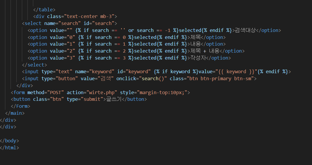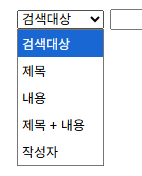 option을 사용하게 되면 이런식으로 배열이 되구요 if search는 0번 1번 2번 3번을 누르면 제목 내용 제목+내용 작성자 이런식으로 옮겨 갑니다