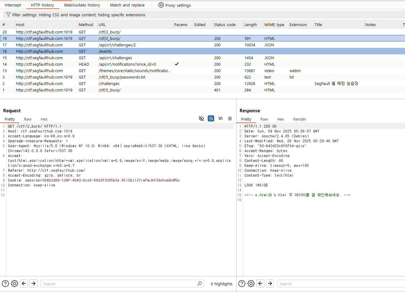 이게 버프스위트 화면인데요 오른쪽을 잘 보시면 a.html과 b.html 이 두 데이터를 잘 확인해 보라고 힌트가 나와있네요.