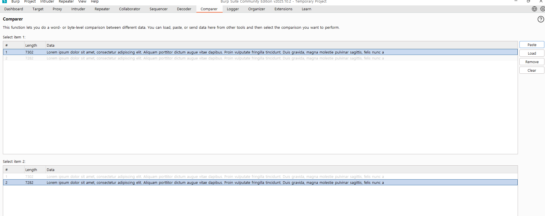 b.html도 마찬가지로 샬라샬라 뭐라고 적혀있네요 이 두 데이터를 비교하는 문제 같은데 이럴때 버프스위트의 기능을 활용할 수 있겠습니다.